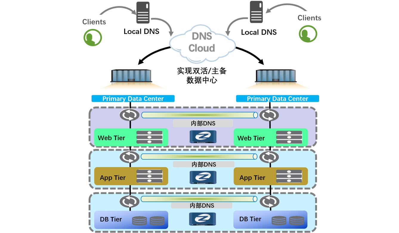 顺利获得内、外部DNS系统的协同,将互联网应用的域名解析引导到数据中心内部的全球负载均衡设备上,达到应用门户智能分流和自动容灾的目的,可以用户地域、用户线路、应用类型等方式分别进行容灾